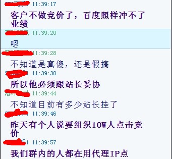 ![]() 圖片中的對話不是PS的,的確是真實的,百度官方聲稱“在我們的評估中,本次升級將會影響5%的搜索流量,此措施已經(jīng)生效”,我們在各大論壇,QQ群,站長網(wǎng)都會看到這樣的信息,5%的搜索量,已經(jīng)讓很多站長趴倒在地了,站起來需要很長時間。 隨著時間的推長,惡意點擊百度競價的站長也越來越多,目前已經(jīng)有人組成10w的站長參與此事,不惜成本和代價來引起百度的重視,下圖是今天早上和一位站長的聊天記錄。